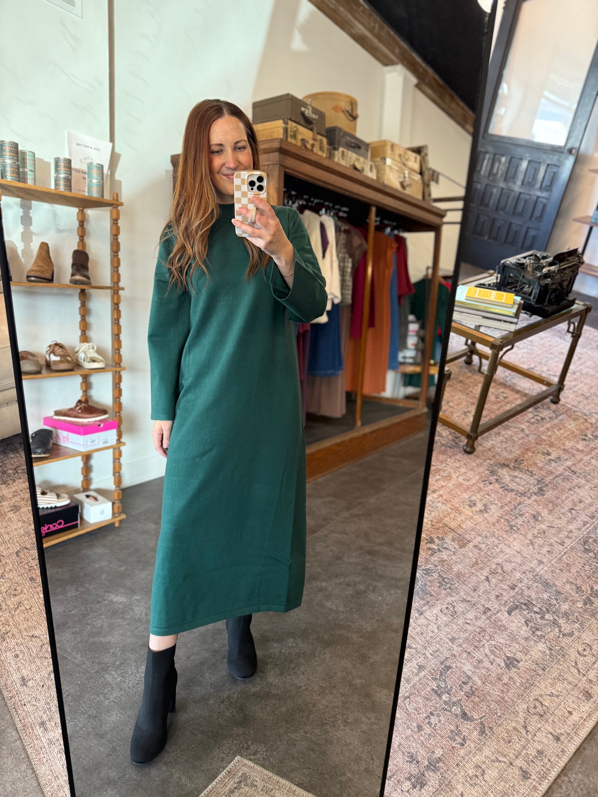 Experience ultimate comfort and style with our Cozy On Up Dress Pine. Featuring a solid mock neck, long sleeves, and a midi length, this dress offers a sleek and modern look. Stay warm and elegant with its knit construction and medium weight fabric. Perfect for any occasion.