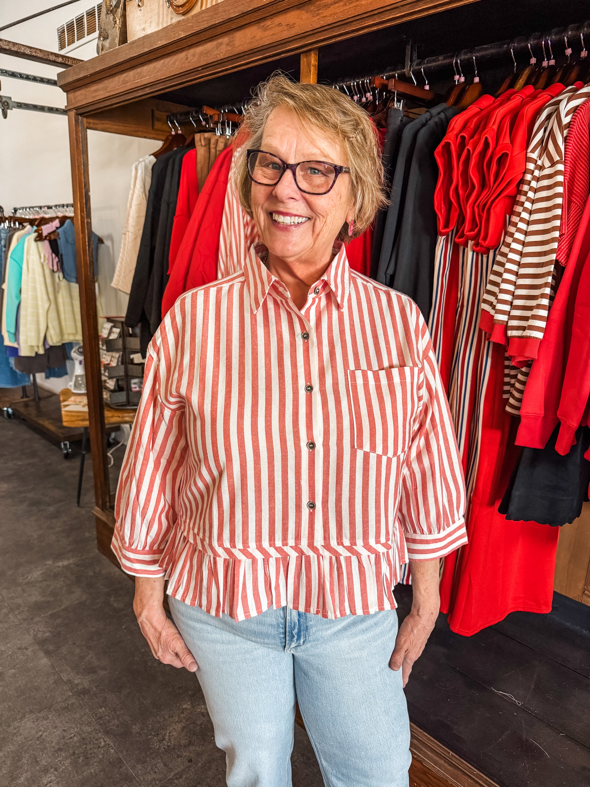 Get ready to strut your stuff in the Doing Girly Things Shirt! This raspberry delight (yes, it's fruity and fabulous!) features a snazzy stripe design and a collar that buttons up as if it's ready for tea with the Queen. The ruffle hem adds a playful twist—perfect for twirling like no one's watching!