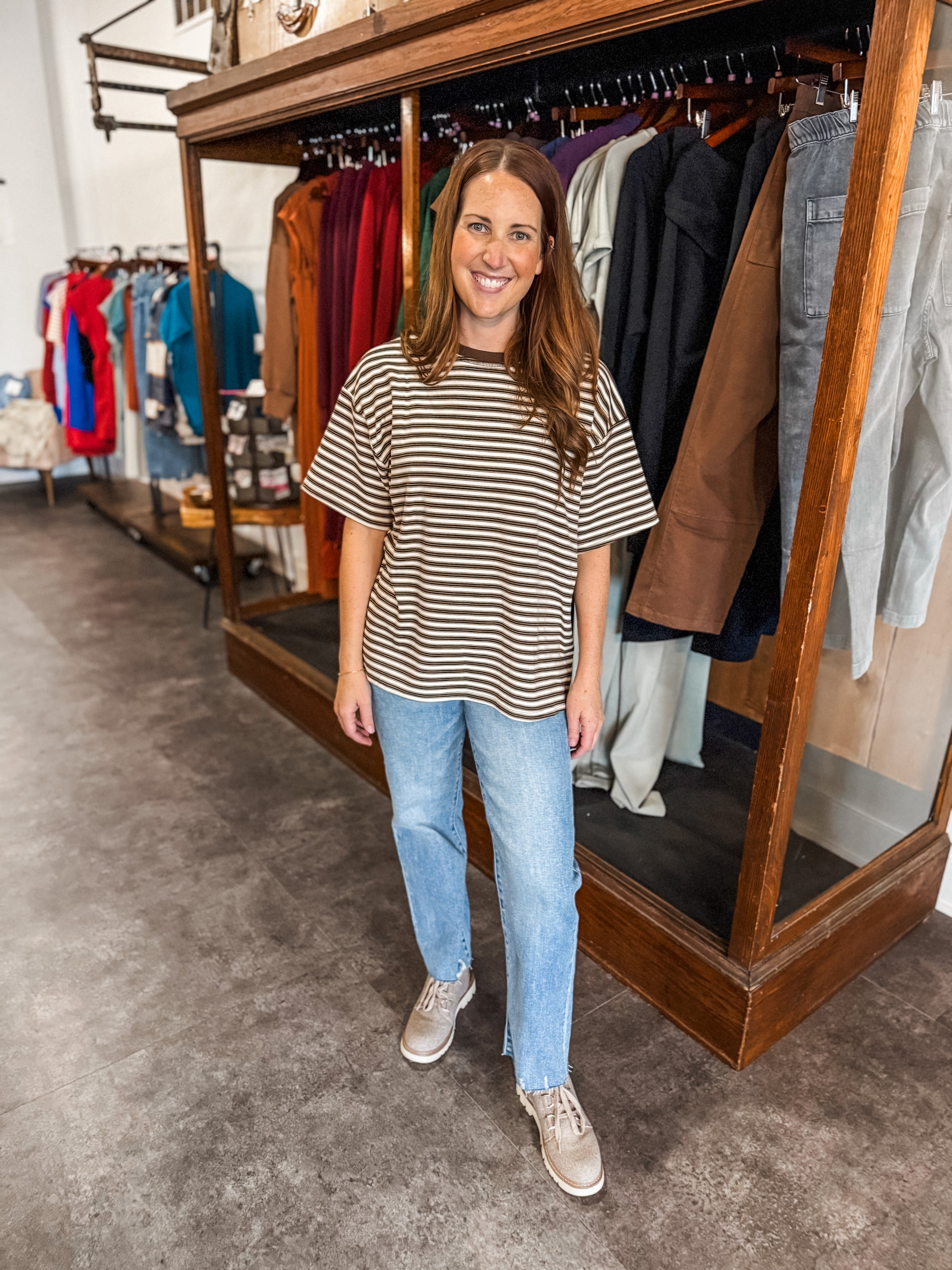 Get ready to fall head over heels for our Falling Into Stripes T Brown! With ultra soft fabric and a boxy oversized fit, you'll be living in comfort and style. The brown stripes add a touch of quirky charm to this cozy tee. Don't miss out on this must-have addition to your wardrobe!