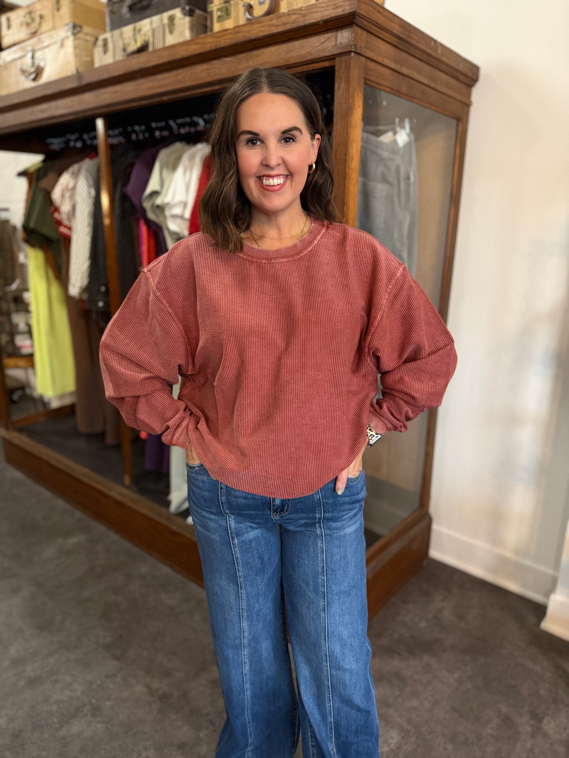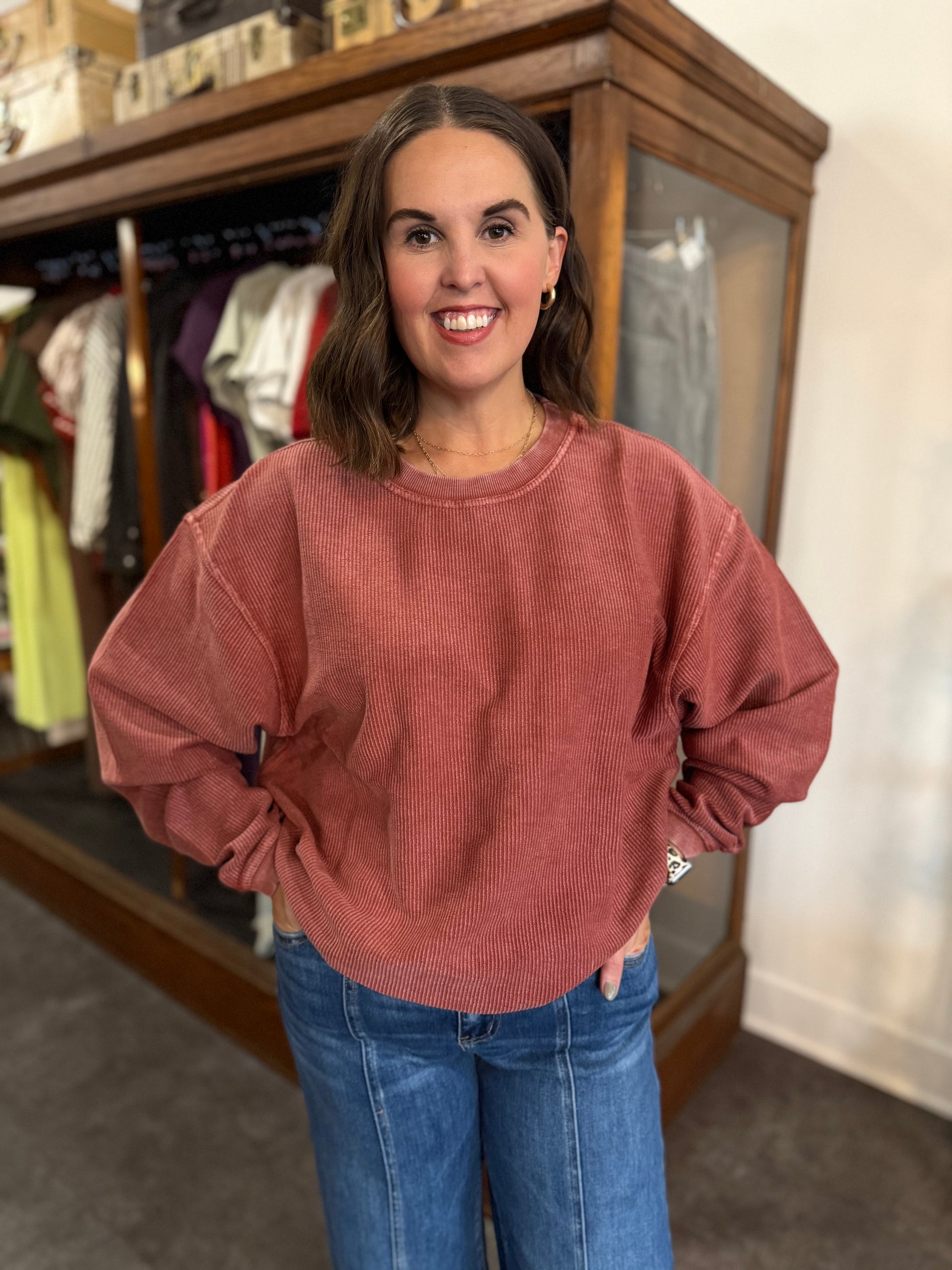 Get cozy and quirky with our Fired Brick Corded Crew! This soft and oversized corded crew is perfect for fall in a rustic fire brick color. Stay warm and stylish all season long.