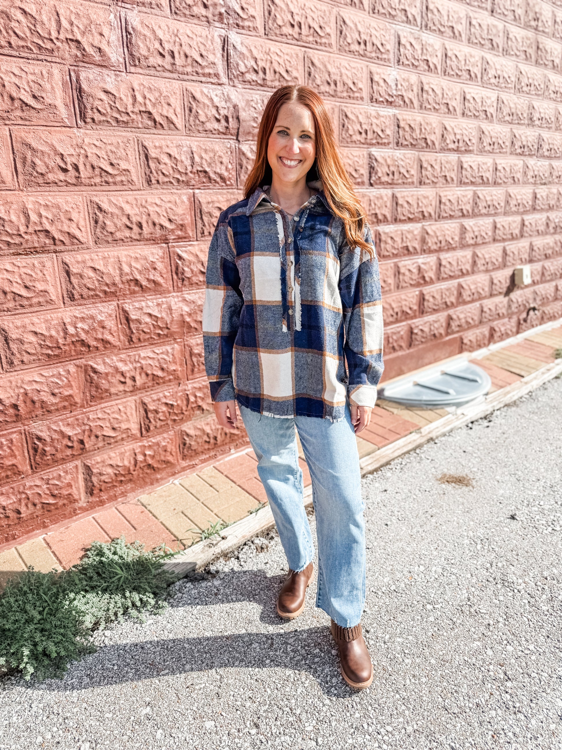 Get ready to "flannel" in love with this comfy meets cute shirt! With blue, brown, and tan huse it gives off a cozy vibe, while the quarter button up and exposed seam add a touch of playfulness. With a side slit and longer length, this shirt offers both style and comfort.