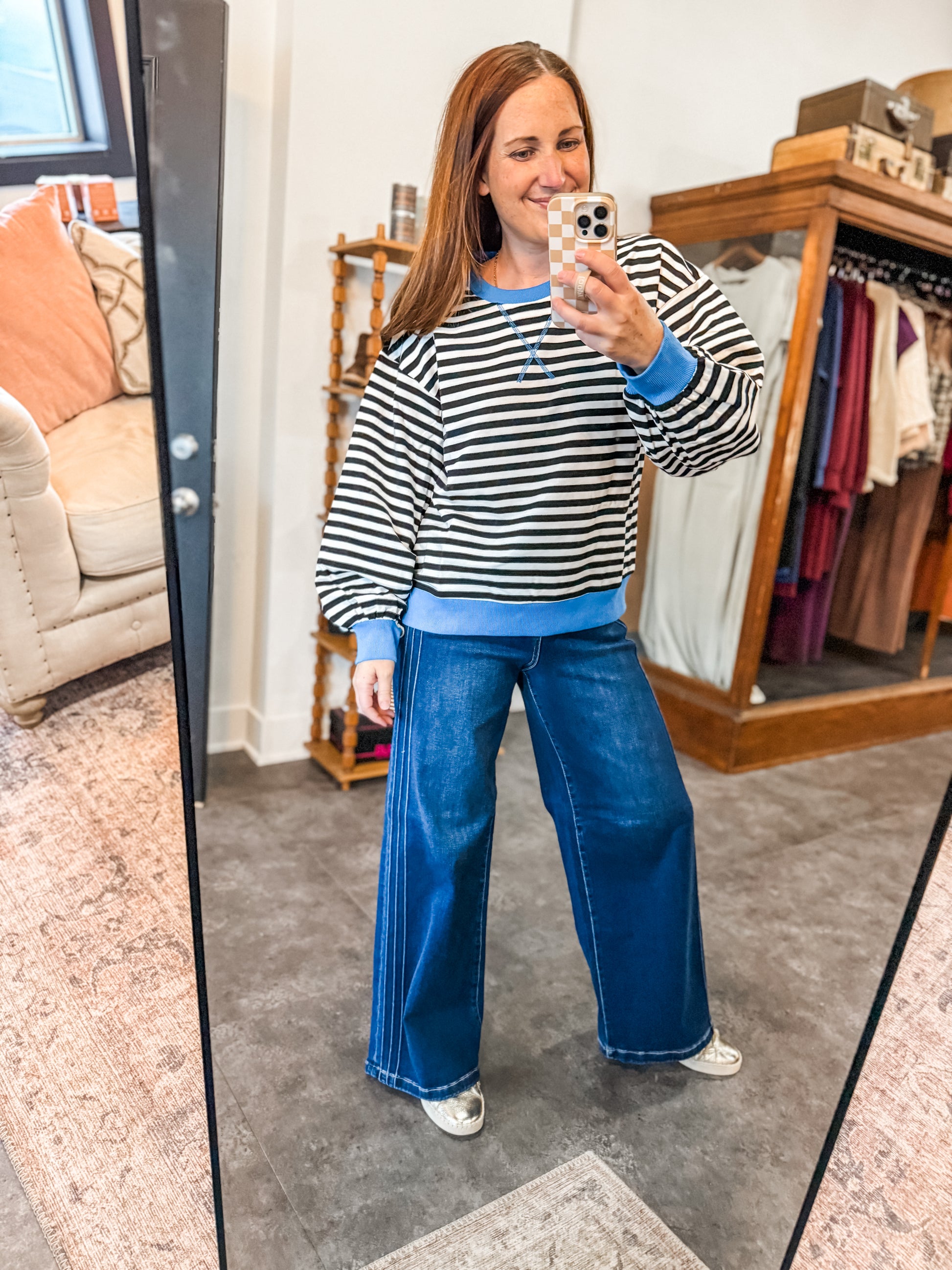 Stay stylish and comfortable with our Game On Sweatshirt Ivory/Blue. This sweatshirt features long puff sleeves, a v-notched neckline, and solid contrast binding detail. Perfect for any occasion, this sweatshirt will keep you warm while making a statement. Upgrade your wardrobe today with this must-have item.