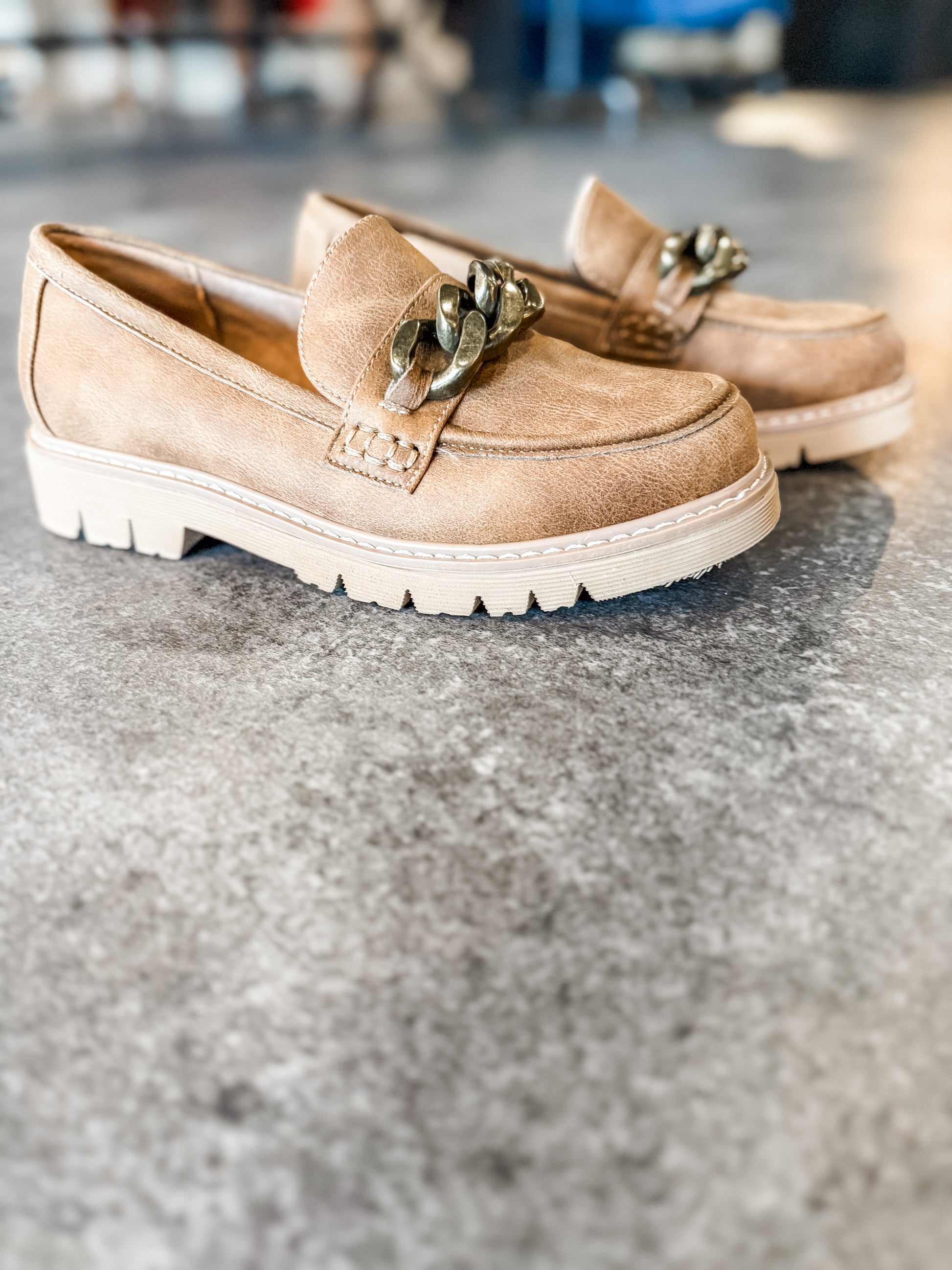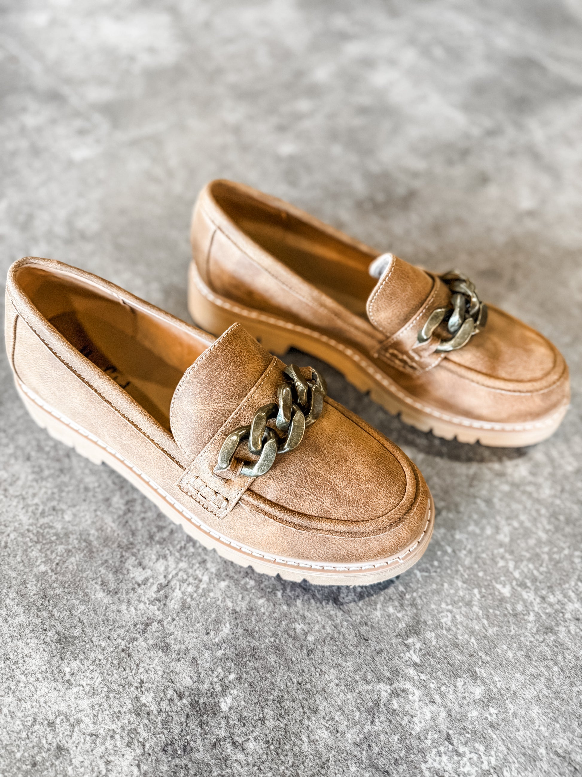 Elevate your shoe game with Not Literally Shoes Tan. These loafers feature a distressed tan upper, statement gold chain detail, and a chunky lug sole for comfort and traction. Simply slip them on for a chic and versatile look. Trend alert: get them before they're gone!
