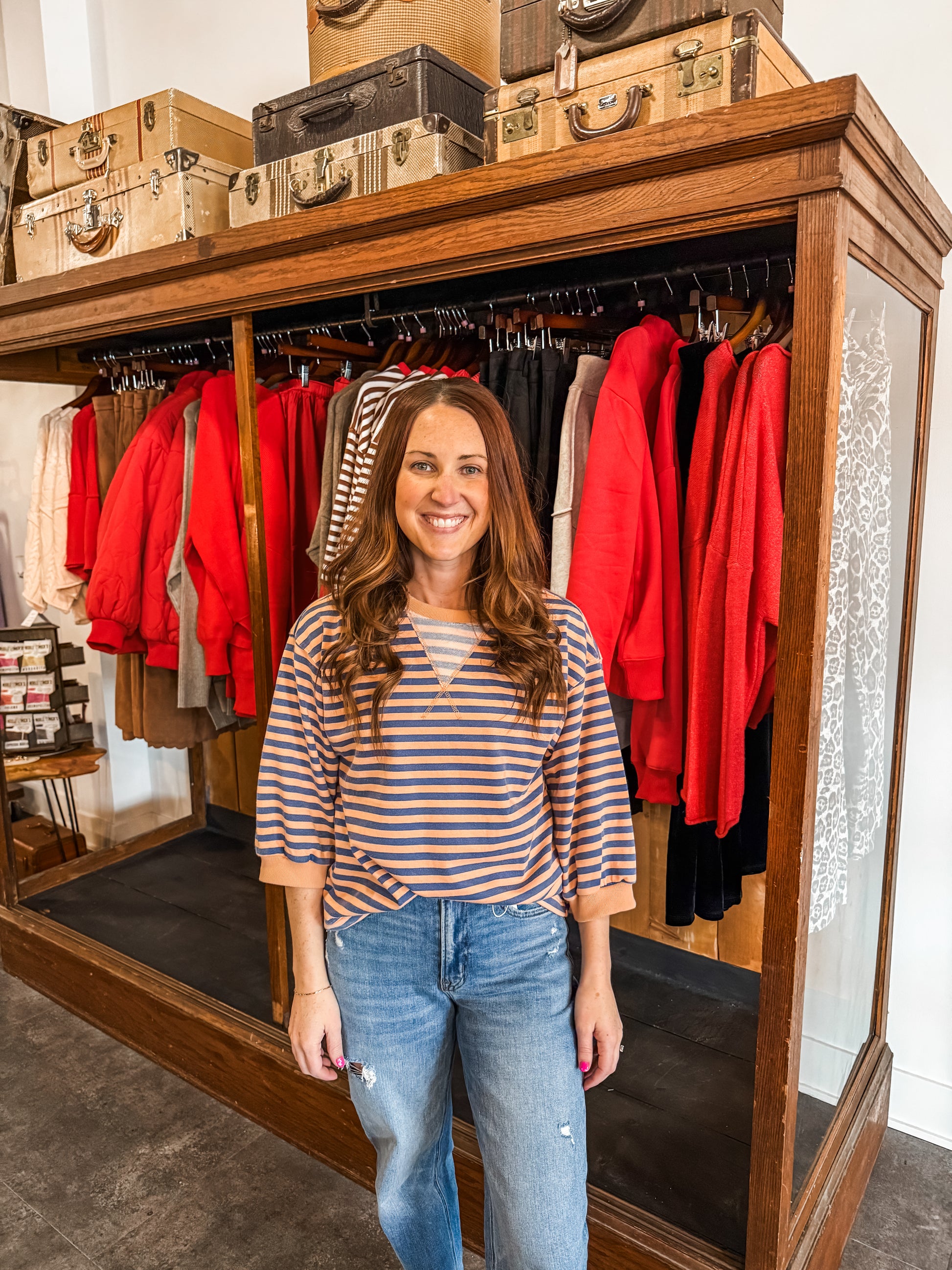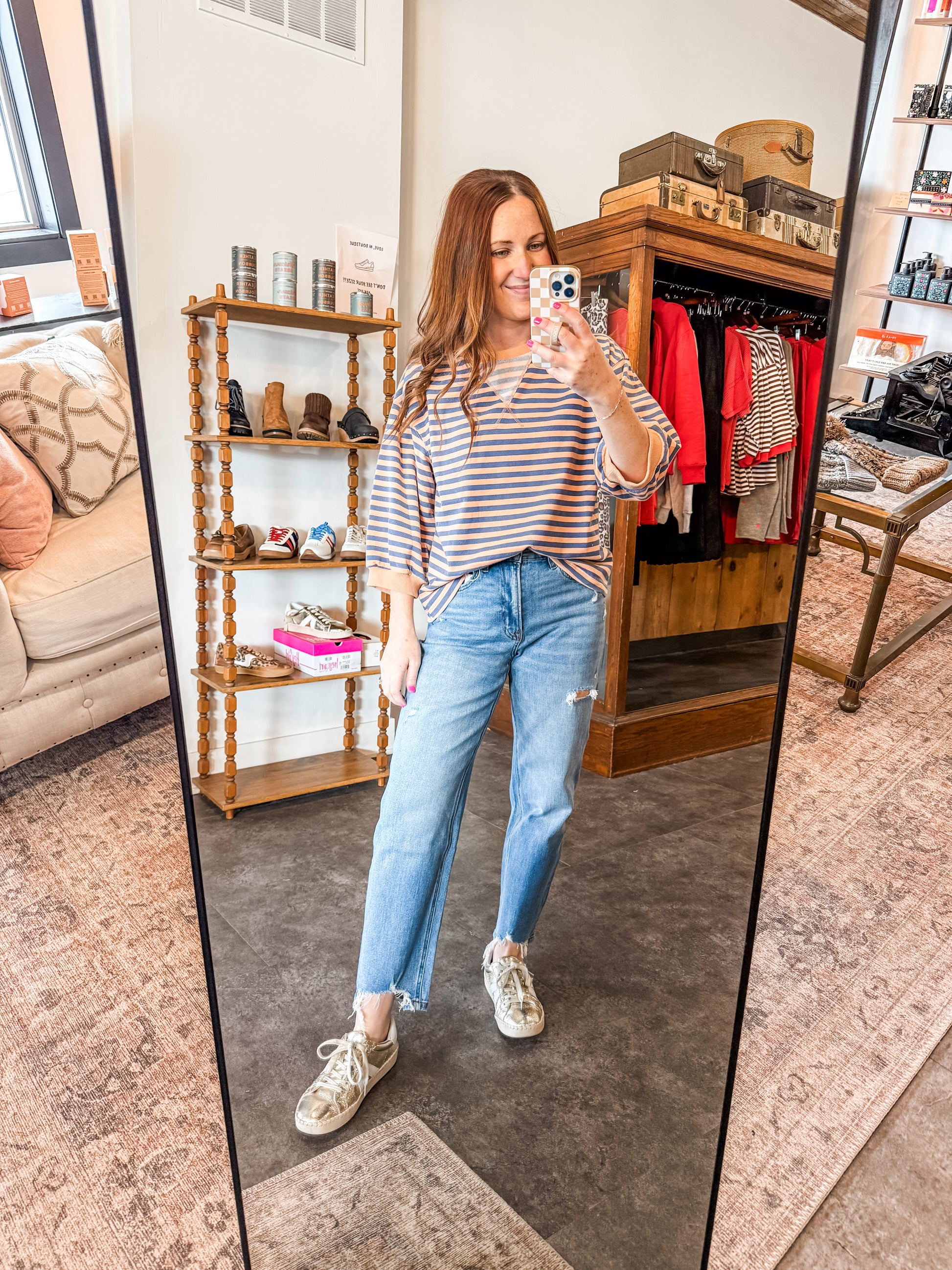 Get ready to stripe up your life with the Springtime Stripes Shirt in a gorgeous melon and blue combo! With three-quarter sleeves for that breezy vibe and a relaxed fit that says, “I’m chillin’,” this soft and comfy shirt is basically a hug for your torso. Perfect for those days when you want to look cute without trying too hard! (Because who’s got the time?)