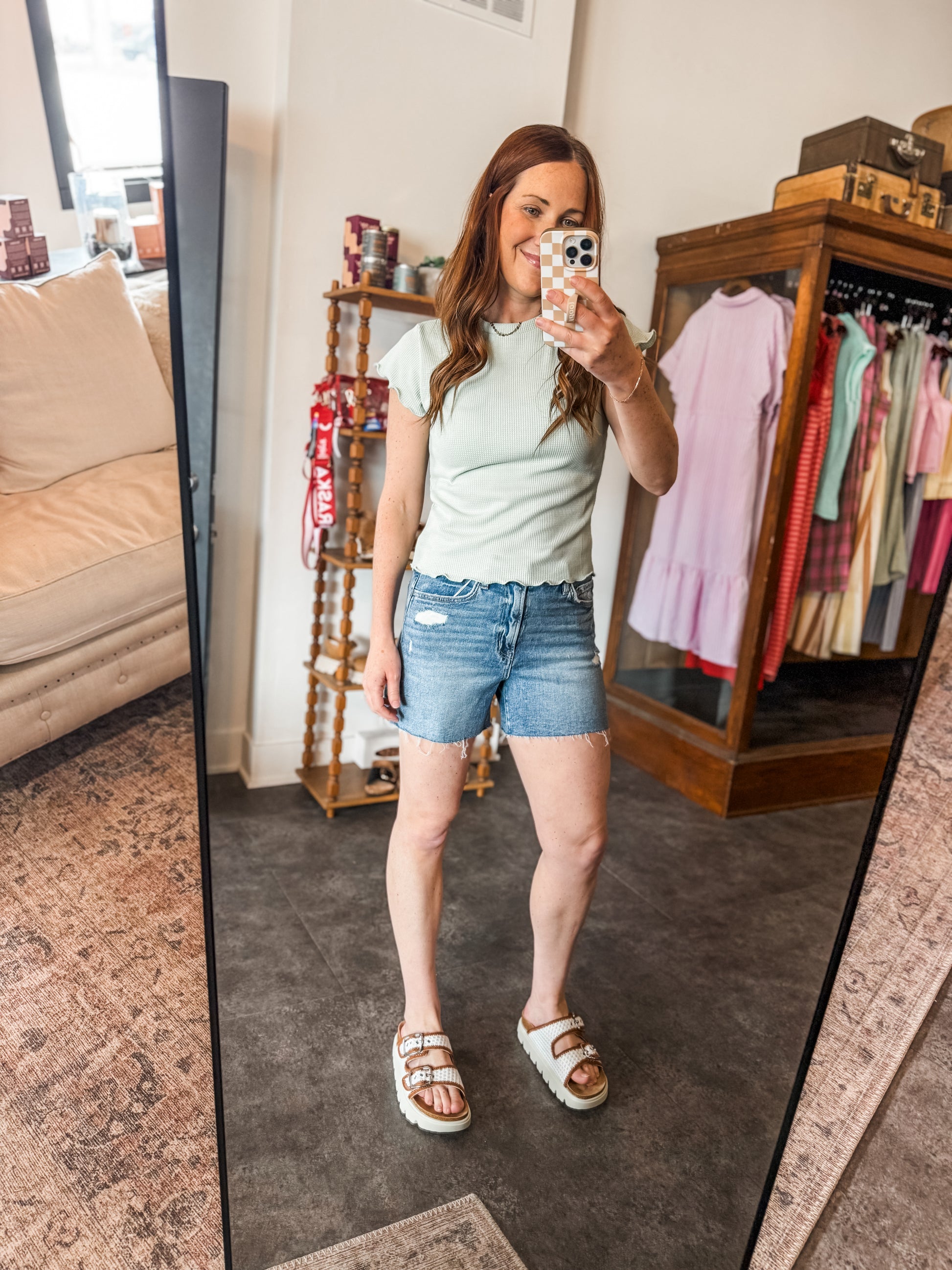 The Simone T Sage is a lettuce hem mini waffle knit top, designed for optimal comfort and style. The waffle knit structure provides breathability, while the lettuce hem adds a unique aesthetic flair. Suitable for layering, this top offers versatility for various occasions.