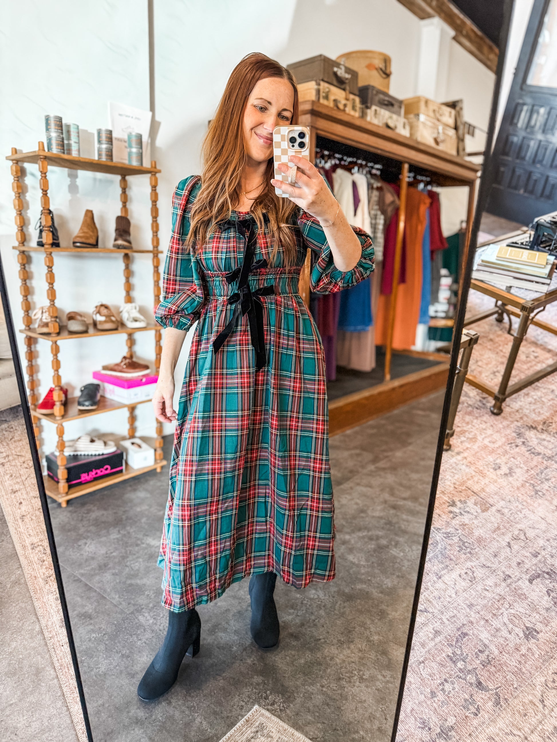 'Tis the season to be stylish with our Tinsel and Traditions Dress in festive green plaid. This midi dress features a cinched waistband for a flattering fit, while the velvet bow adds a touch of elegance. Get ready for compliments all night long!