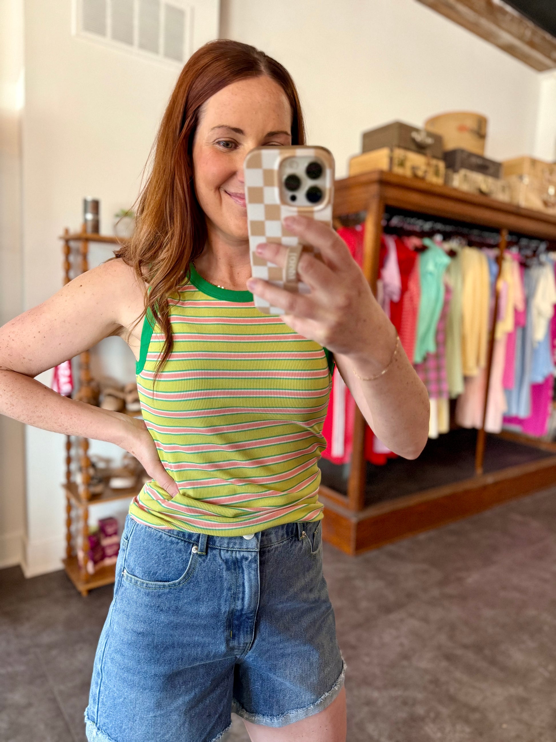 The When Life Gives Lime Tank features a green and pink contrast striped ribbed knit design, enhancing visual appeal while ensuring comfort through its stretchy fabric. This composition allows for ease of movement, making it suitable for various activities. Ideal for layering or casual wear, it provides versatility in style.